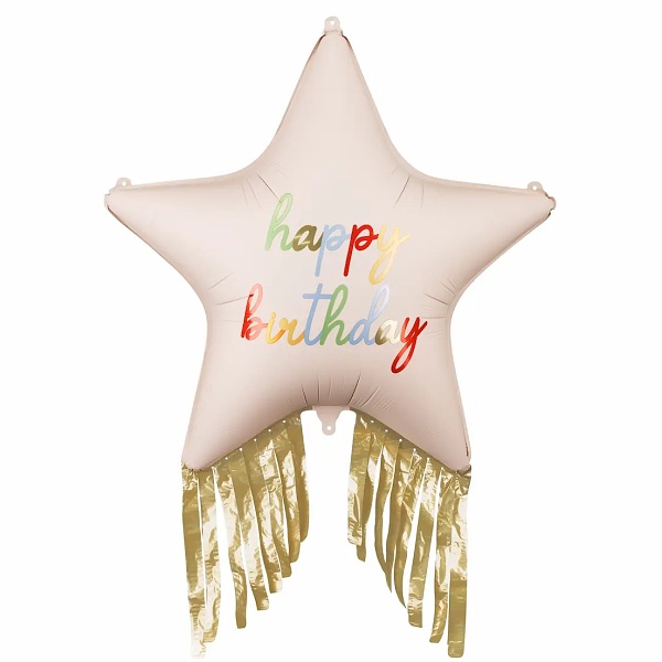Vytvořte narozeninovou atmosféru s tímto krásným fóliovým balónkem ve tvaru hvězdy se zlatými třásněmi a potiskem "Happy Birthday". Balónek je v moderní a barevné kombinaci, která okamžitě dodá vaší narozeninové dekoraci energii a radost.