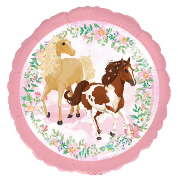 Krásný fóliový balónek se dvěma Koníky s růžovým květinovým pozadím.