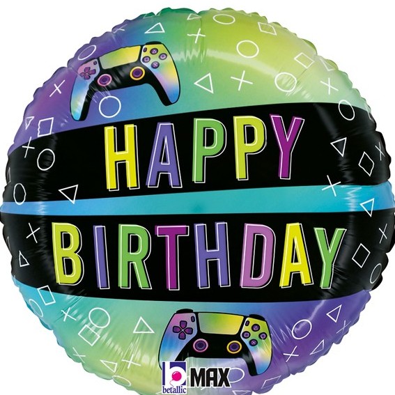 Fóliový balónek kulatého tvaru s herním ovladačem a nápisem Happy Birthday potěší každého hráče a je ideální doplněk výzdoby na narozeninovou oslavu s herní tematikou.