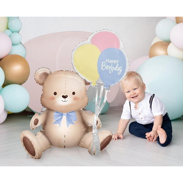 Fóliový balónek ve tvaru roztomilého medvídka světle hnědé barvy s modrou mašlí a s balónky s nápisem Happy Birthday.