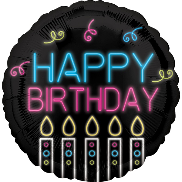 Darujte k narozeninám tento skvělý neónový fóliový balónek v černé barvě s nápisem přání všeho nejlepšího a nechybí ani narozeninové svíčky.
