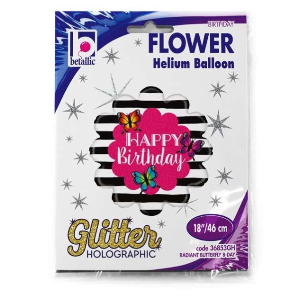 Fóliový balónek Happy B-Day Floral s proužky a motýlky