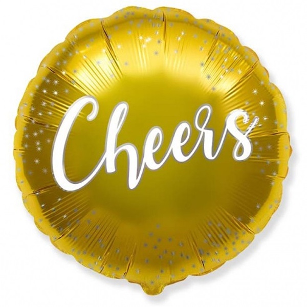 Fóliový balónek zlaté barvy s bílým nápisem Cheers je vhodný jako dekorace na narozeninovou oslavu ve zlaté barvě nebo silvestrovskou párty.