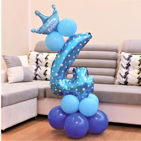 Modrá sada balónků k oslavě čtvrtých narozenin - modrý puntík puntík, korunka. Tato krásná prostorová dekorace s číslem se stane středobodem narozeninové výzdoby pro každou romantickou slečnu, paní i holčičku. Balónky snadno nafouknete vzduchem a sestavíte dle návodu. Na krásnou 110 cm vysokou dekoraci nebudete potřebovat helium. Foliové balónky nafouknete přiloženou dutou tyčkou, balónky zafixujete přiloženými lepicími terčíky