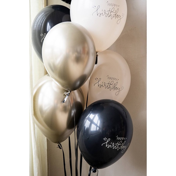 Balónkový set se skládá ze 6 ks latexových balónků: 2 chromové, 2 černé a 2 krémové.
