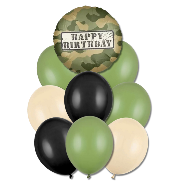 Originální vojenský (military) balónkový buket inspirovaný světem armády a vojáků je ideální volbou pro narozeninovou oslavu malého i velkého fanouška vojenského stylu. Barevná kombinace zelené, černé a maskáčového motivu vytváří autentickou army atmosféru a výraznou dekoraci každé oslavy.