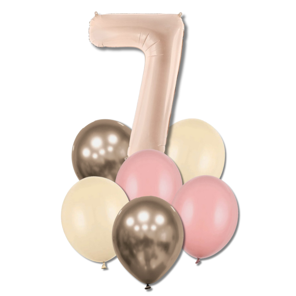 Stylový balónkový buket s číslicí 7 v elegantních a jemných odstínech tmavě béžové, zaprášené růže, alabastru a třpytivého chromového prosecca. Ideální na oslavu 7. narozenin, výročí nebo jiné výjimečné události.