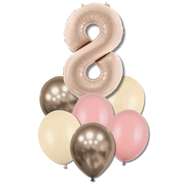 Stylový balónkový buket s číslicí 8 v elegantních a jemných odstínech tmavě béžové, zaprášené růže, alabastru a třpytivého chromového prosecca. Ideální na oslavu 8. narozenin, výročí nebo jiné výjimečné události.