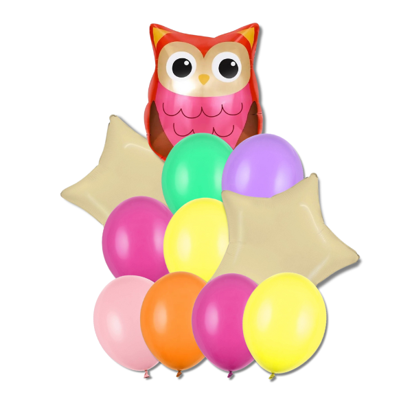 Roztomilý a barevný balónkový buket s motivem sovičky. Ideální pro dětské oslavy, narozeniny nebo podzimní párty.