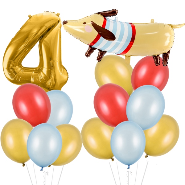 Veselý narozeninový set s jezevčíkem v pruhovaném triku, zlatou číslicí 4 a mixem 12 balonků v barvách zlatá, modrá a červená. Ideální pro malou oslavu s velkou radostí!