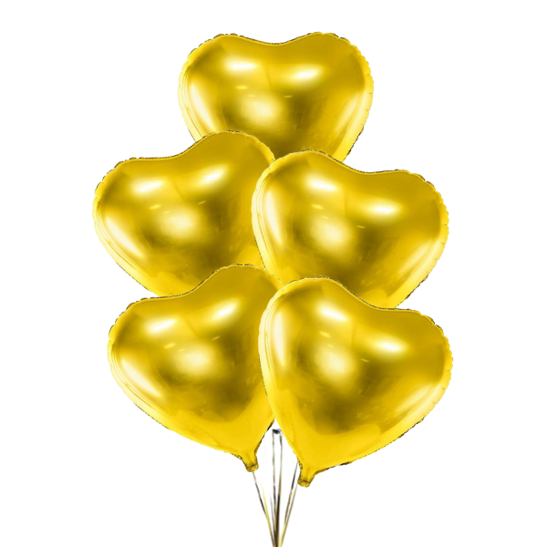 Tento set obsahuje 5 zlatých balónků ve tvaru srdíčka o velikosti 45 cm.