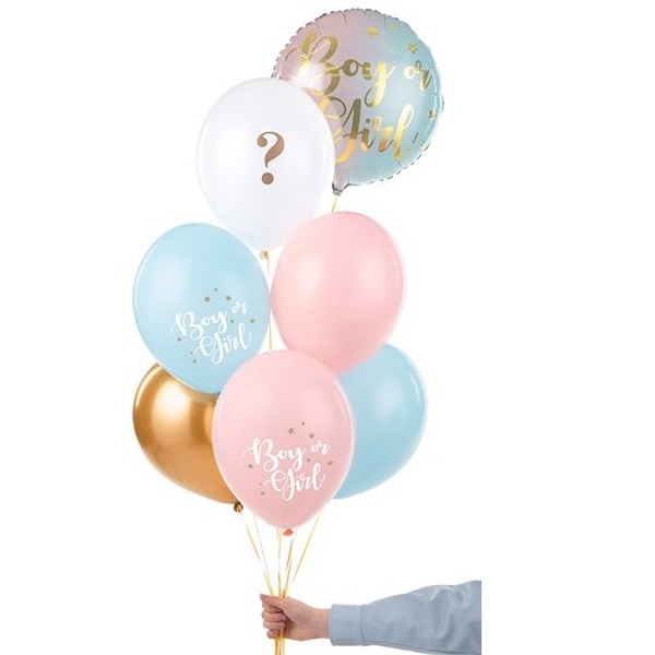 Balení obsahuje 6 ks balónků (1x pastelový světle modrý s bílým a zlatým potiskem, 1x pastelový v barvě světle růžové s bílým a zlatým potiskem, 1x pastelový bílý se zlatým otazníkem, 1 v pastelový ve světle modré barvě, 1x pastelový ve světle růžové barvě a 1x ve zlaté chromové barvě),