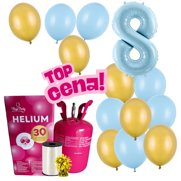 Obsahem setu je foliová číslice 8 o velikosti 86 cm v bleděmodré barvě, 9 ks větších latexových balónků o průměru 30 cm v barvě modré a zlaté,