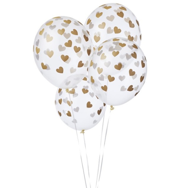 Latexový transparentní balónek s celoplošným potiskem zlatých srdíček