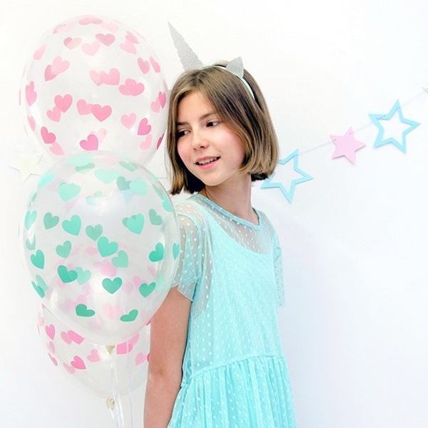Latexový transparentní balónek s celoplošným potiskem růžových srdíček