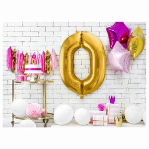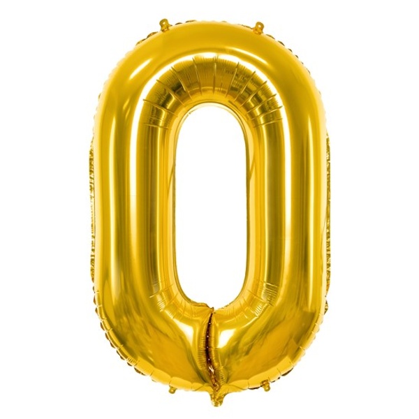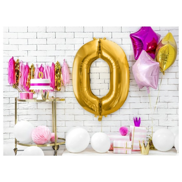 Zlatá foliová číslice 0 je vhodným doplňkem výroční, novoroční i narozeninové výzdoby.