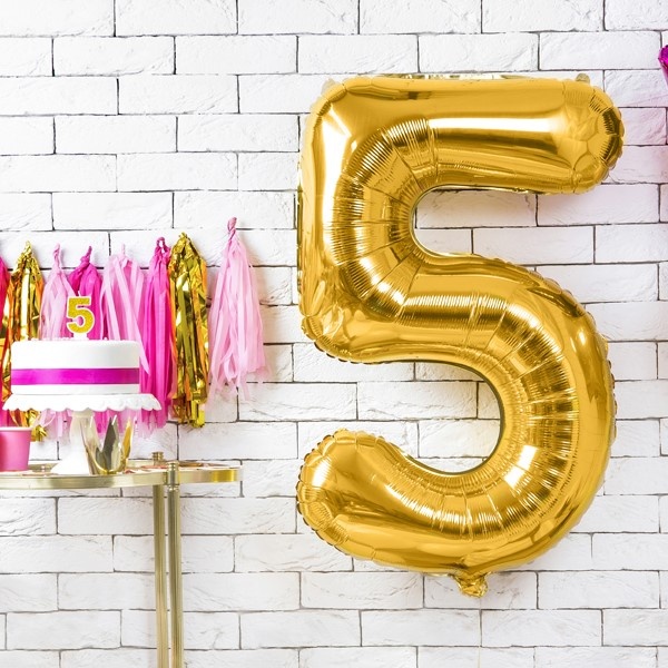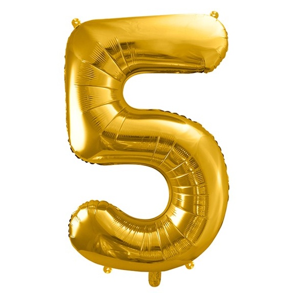 Fóliová zlatá číslice 5 je vhodným doplňkem výroční, novoroční i narozeninové výzdoby.