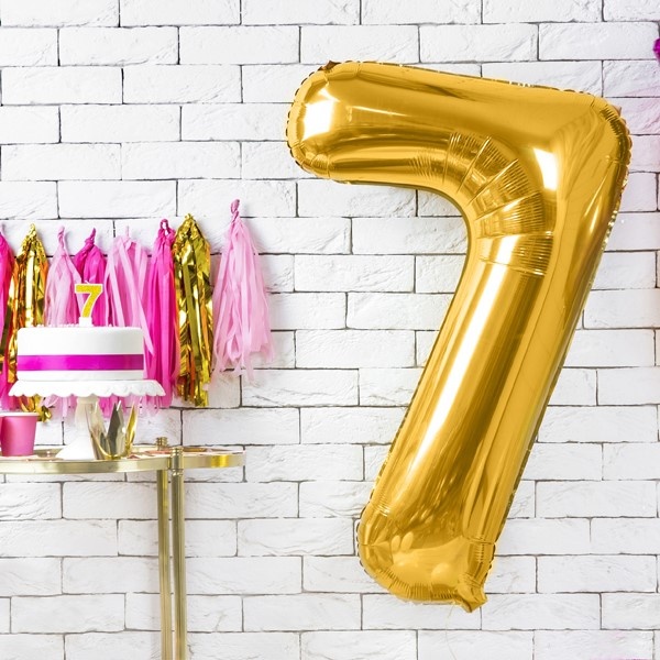 Fóliová zlatá číslice 7 je vhodným doplňkem výroční, novoroční i narozeninové výzdoby.