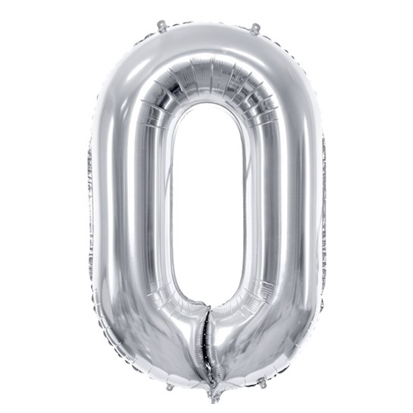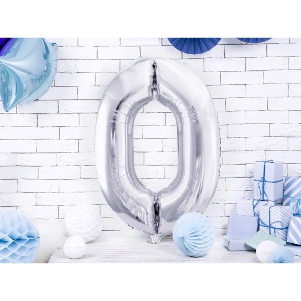 Stříbrná foliová číslice 0 je vhodným doplňkem výroční, novoroční i narozeninové výzdoby.