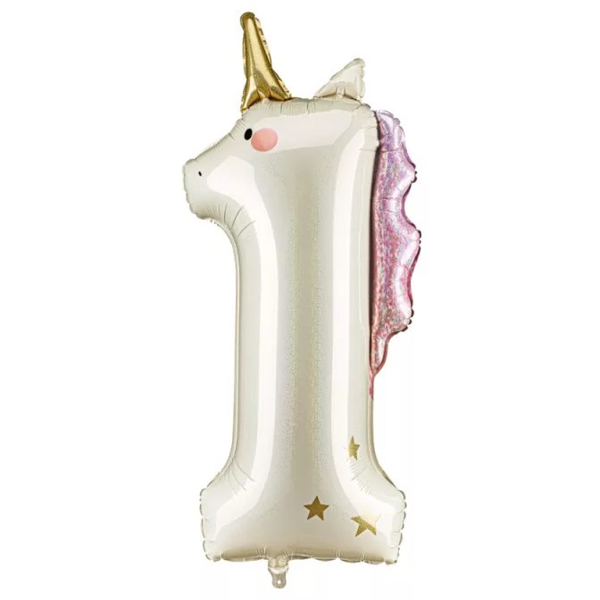Vytvořte oslavu 1. narozenin vašeho dítěte ještě výjimečnější s tímto krémovým holografickým fóliovým balónkem v motivu Jednorožce a ve tvaru čísla 1.