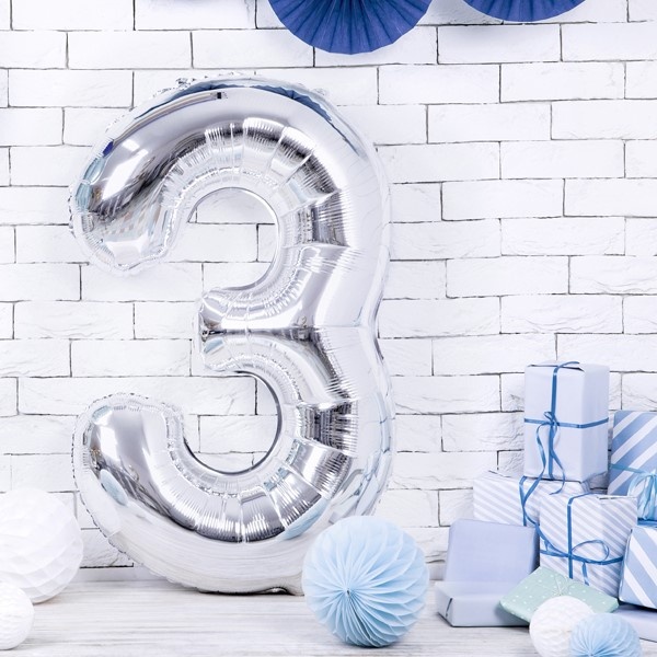 Fóliová stříbrná číslice 3 je vhodným doplňkem výroční, novoroční i narozeninové výzdoby.