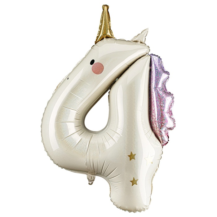 Vytvořte oslavu 4. narozenin vašeho dítěte ještě výjimečnější s tímto krémovým holografickým fóliovým balónkem v motivu Jednorožce a ve tvaru čísla 4.