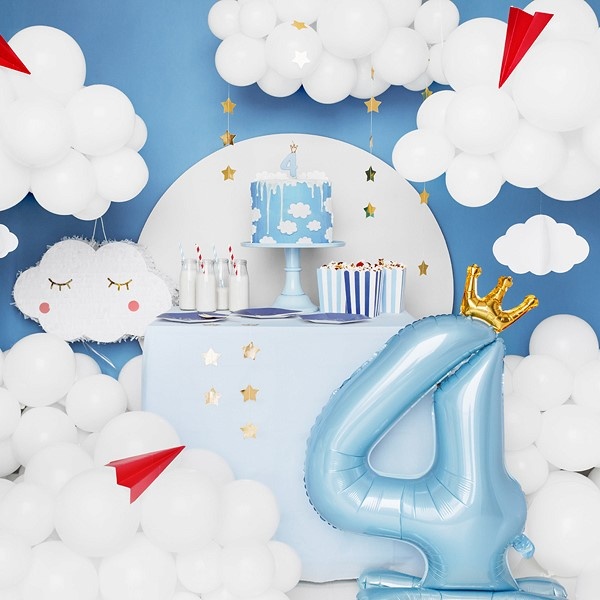 Fóliový stojací balónek číslo 4 v nebesky modré barvě se zlatou korunkou