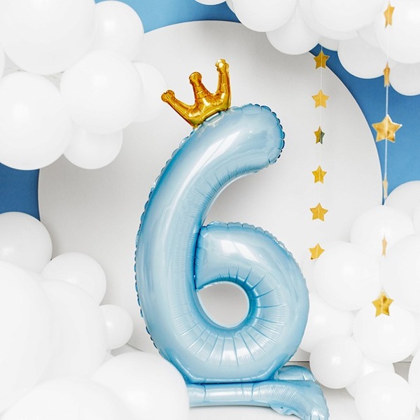 Fóliový stojací balónek číslo 6 v nebesky modré barvě se zlatou korunkou