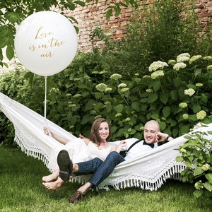 Bílý balón obřích rozměrů s nápisem Láska je ve vzduchu je oblíbenou svatební dekorací, kterou lze využít při svatební