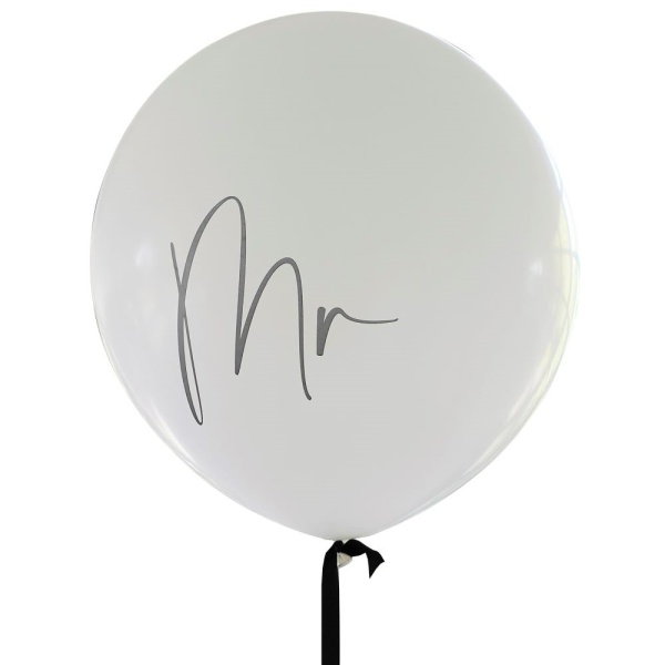 Bílý latexový balón XL s černým nápisem "Mr" má průměr 91 cm.