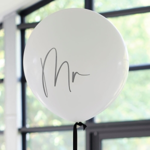 Efektní balon obřích rozměrů bílé barvy s černým nápisem Mr. a černou stuhou je oblíbenou svatební dekorací, kterou lze využít při svatební výzdobě, do fotokoutku nebo na svatební tradice s vypouštěním balónu s přáním novomanželů.
