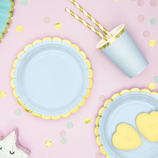 Stylové kelímky světle modré barvy se zlatým metalickým vroubkovaným okrajem.