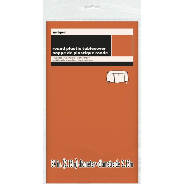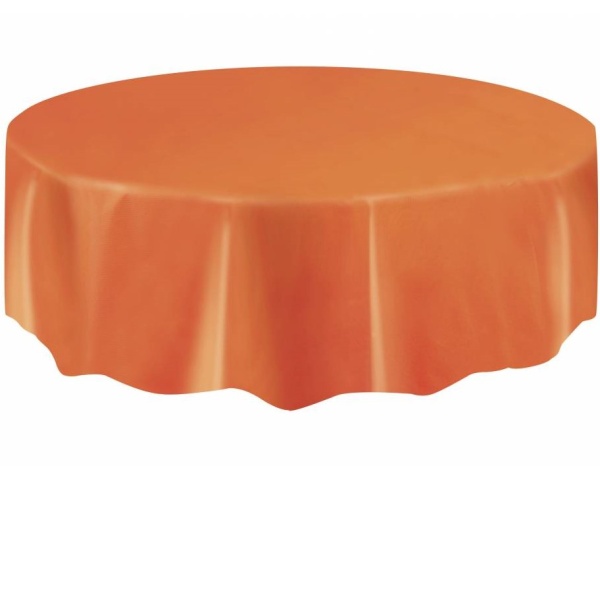 Kulatý oranžový plastový ubrus bude zářit na každém stole.