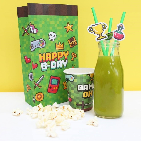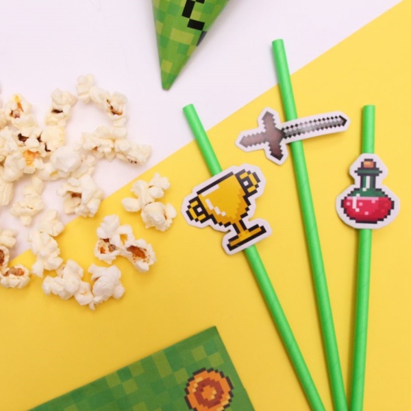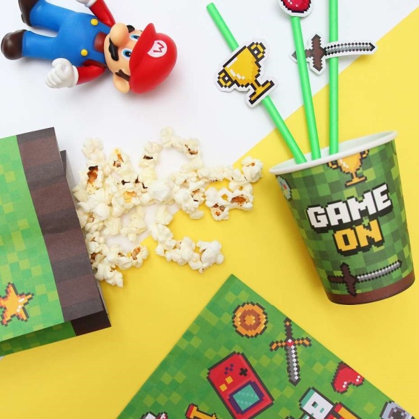 Papírová brčka Game On Party s herními prvky jsou důležitým doplňkem stolování pro malé fanoušky počítačových her.
