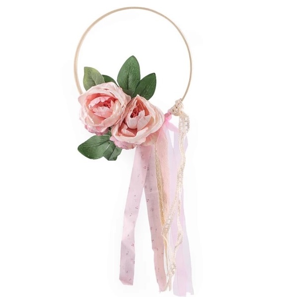 Dekorační svatební kruh s květy, jemnou krajkou a stuhami působí velmi romanticky a bohémsky.