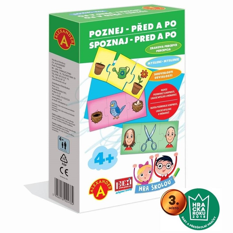Hra školou Poznej před a po je naučná hra pro deti od 4 let. Mezi 36 rozloženými a promíchanými dílky hledají děti sadu 3 společných dílků, které spolu souvisí. Ty je potřeba sestavit tak, aby na nich znázorněný děj šel správně časově za sebou (vždy dva krajní dílky s obrázkem PŘED a PO průběhu děje).