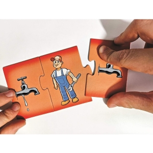 36 ks velkých pevných barevných dílků s obázky (související trojice), které mají specifický tvar pro snazší spojování.
