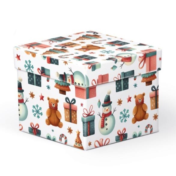 Povrch krabice zdobí obrázky medvídků, dárků, vánočních stromečků, sněhuláků, cukrových hůlek a sněhových vloček.