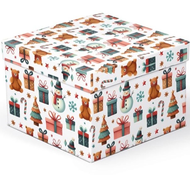Povrch krabice zdobí obrázky medvídků, dárků, vánočních stromečků, sněhuláků, cukrových hůlek a sněhových vloček.
