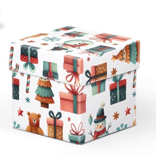 Povrch krabice zdobí obrázky medvídků, dárků, vánočních stromečků, sněhuláků, cukrových hůlek a sněhových vloček.