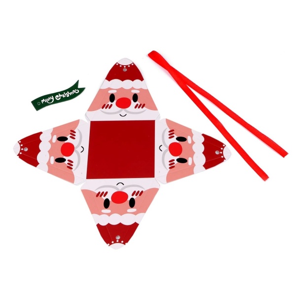 Vánoční krabička ve tvaru pyramidy s obrázkem Santy zaujme děti i dospělé a nejvíce je potěší její obsah. Můžete ji použít na malé dárky nebo naplnit samými dobrotami na Mikuláše. V její horní části se ozdobně zavazuje pomocí přiložené stužky. Součástí balení je i přivazovací vlaječka Merry Christmas.