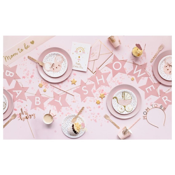 Závěsná dekorace je s růžovým čápem a toto blahopřání je vhodné na tématickou párty baby shower nebo narození holčičky.