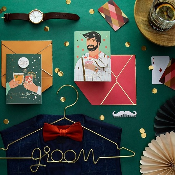 Přání ženichovi v podobě karty s odznakem se špendlíkem Ženich