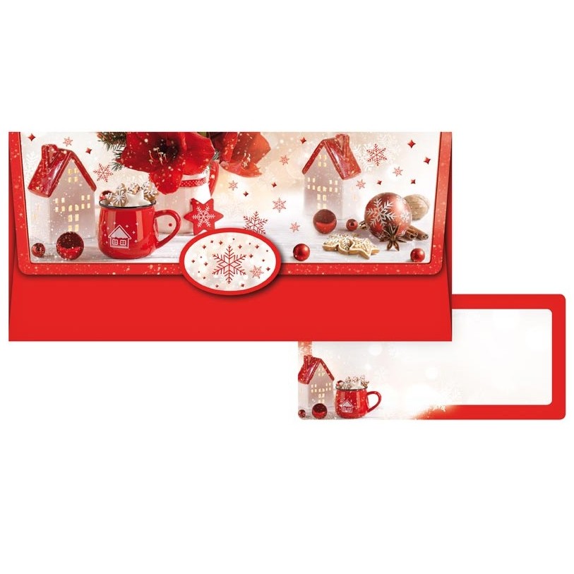 Dárková obálka na peníze v červené barvě s vánočními motivy a uzavíratelnou klopou.