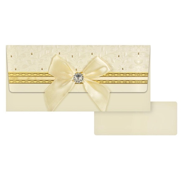 Dárková obálka na peníze krémová s mašlí se zlatými doplňky pro oslavence nebo novomanžele.