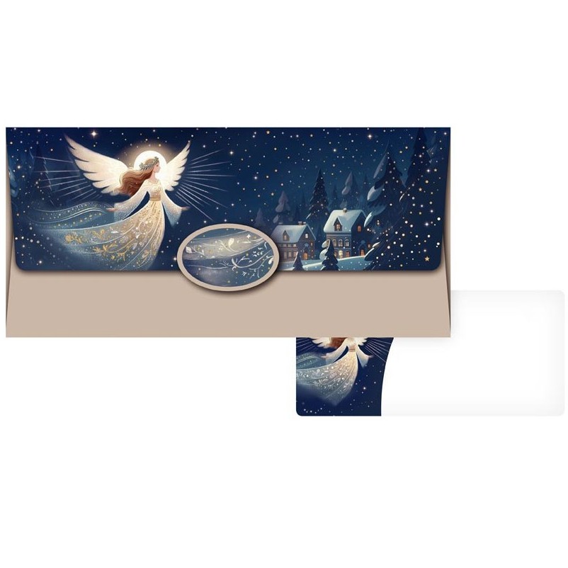 Dárková obálka na peníze v tmavě modré barvě s Andělem a uzavíratelnou klopou.