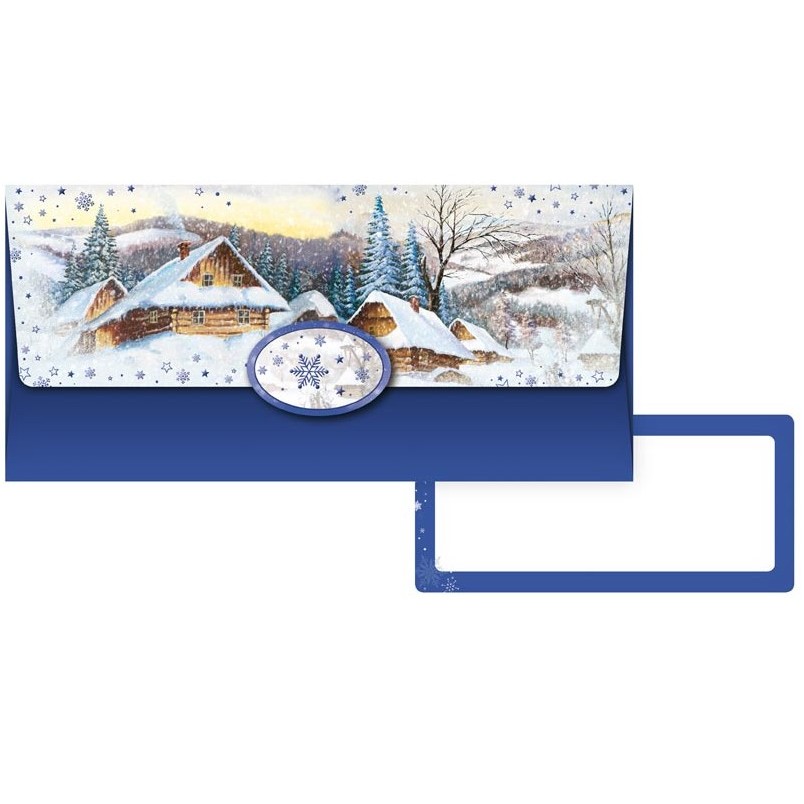 Dárková obálka na peníze modré barvy s vánočním motivem zasněžených chaloupek a uzavíratelnou klopou.