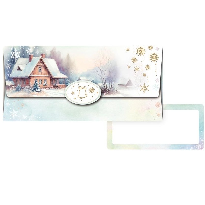 Vdechněte svým vánočním dárkům kouzlo tradice a elegance. Tato vánoční obálka s motivem zasněžené chaloupky a