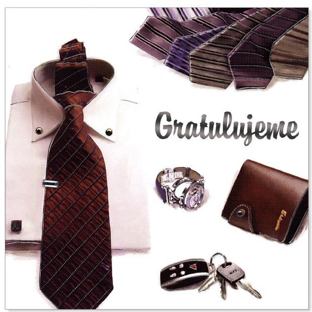 Originální přání Gratulujeme s obrázkem košile, kravaty a dalších pánských důležitých doplňků