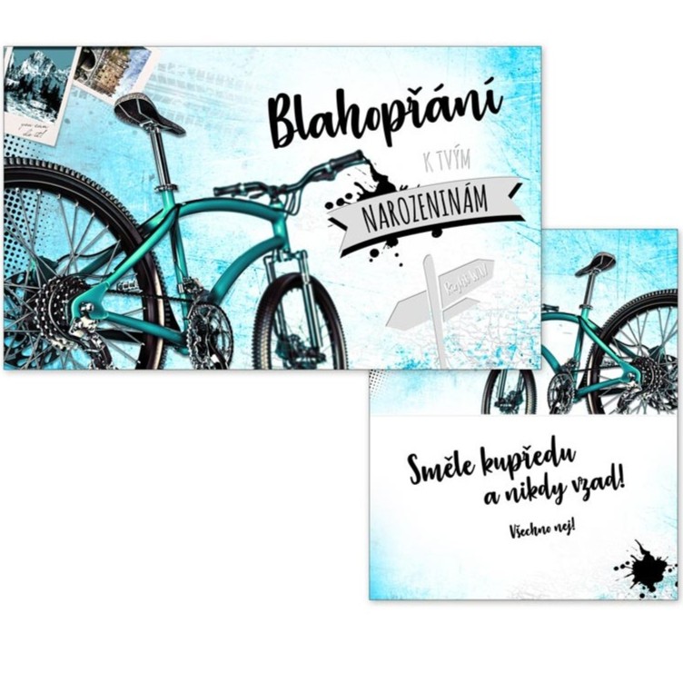 Srdečné přání k narozeninám, svátku nebo jiné příležitosti s obrázkem horského kola.